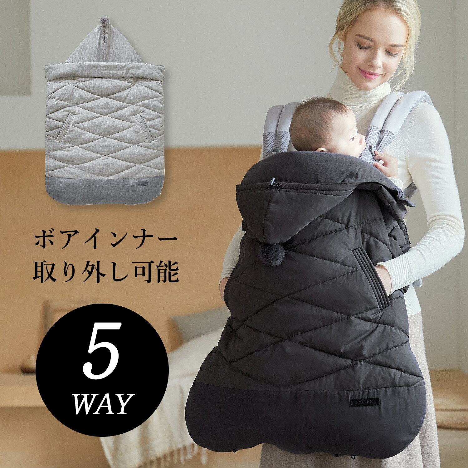 前抱っこ、向かい合わせ、おんぶ、ベビーカー、おくるみの5WAY! 内側ボアは簡単に取り外し可能なので、 気温によって脱装着できます。
