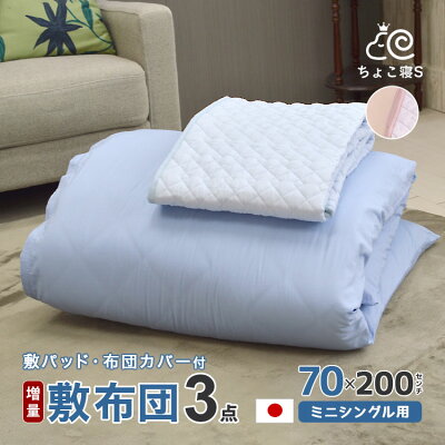 70cm幅サイズのミニシングル敷き布団用 敷き布団 3点セット ボリュームタイプ ・中身増量タイプ 防ダニ 敷き布団(ミニシングルサイズ : 70×200cm) ・敷布団カバー (ミニシングルサイズ: 75×205cm) ・ガーゼ生地 敷パッド(ミニシングルサイズ : 70×200cm) マンションなどの省スペースの収納にも便利な 当店で人気の70cm幅ミニシングルサイズの「敷布団」に 専用の「敷き布団カバー」と「敷きパッド」をお付けした3点セット! 急な来客用や、届いたその日からすぐにお布団を使いたい! という方にもオススメ! 敷き布団のセッティングが一度にできるので、 後は掛け布団をご用意していただくだけですぐにご利用していただけます。