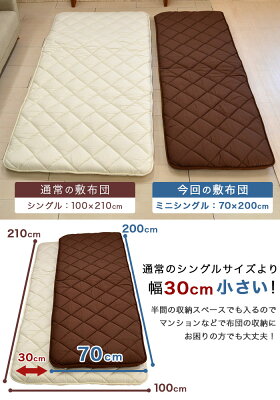 ※さらに「ピンク」「グレー」「ネイビー」の新色3色も追加しました! * * * 普通のシングルサイズの敷布団より、30cm小さい70cm幅のミニ敷布団です。